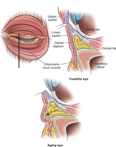 The eyes and eyelids are very complex and delicate areas and, as such, need to be approached and treated with care. Recent studies have shown that changes occur in the bony structure surrounding the eye and have a substantial impact on the aging process, especially with respect to volumetric changes. The periorbital aging process is complex; it is a three-dimensional process that affects not only the skin, but also constantly interacts with the underlying layers— adipose tissue, muscles, and bones. The aesthetically attractive lower eyelid should display a relatively smooth transition between the preseptal and orbital portions of the orbicularis oculi muscle and continue into the upper malar region without a definable transition point.