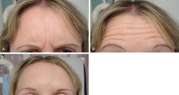 A 33-year-old patient wished to have a smoother forehead, improved brow contour, and reduction in the periorbital rhytids, which resulted from both photoaging and contraction of the orbicularis oculi muscles.