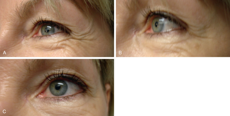 Botox was used to weaken the orbicularis oculi muscle and allow the frontalis to cause a minimal elevation and open up the eye area. This technique can also become useful before or after periorbital laser resurfacing augments the effects of the laser and helps maintain the improved appearance of wrinkles, as can be seen in the next case.
