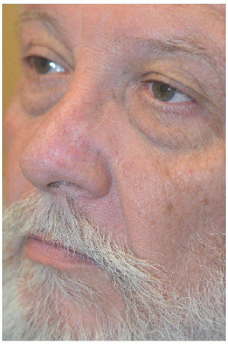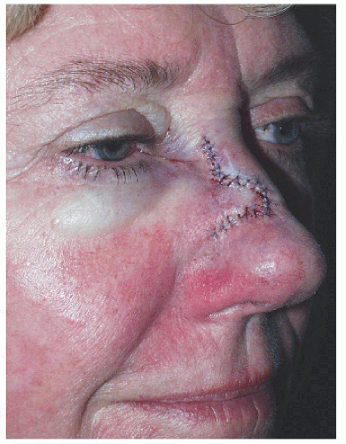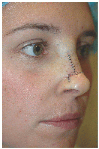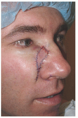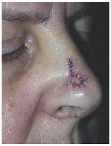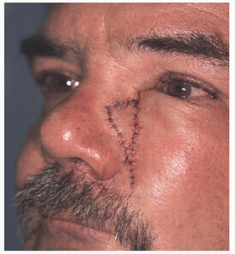 In this case, as the defect is relatively anterior on the nose (i.e., closer to the midline than the cheek), a lateral-based pedicle was used, and the flap was designed so that the excised tricone would sit just above the alar crease (Figs. 5.4B, C, D). For defects more posterior on the nose, a medial-based pedicle would be considered (see Section 5.9).