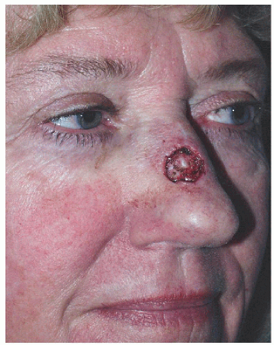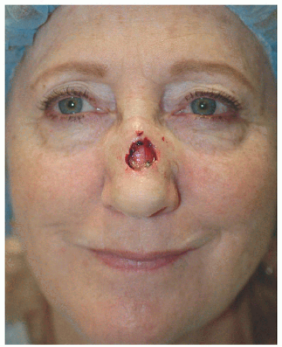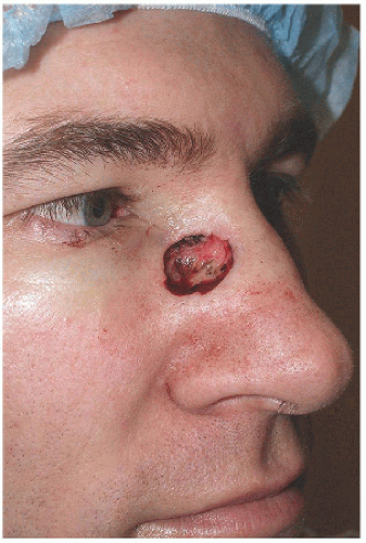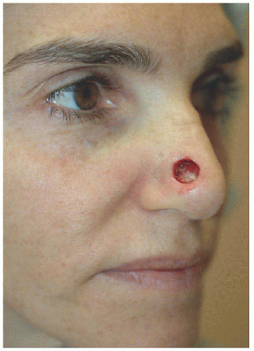 ![]() Figure 5.1E. Surgical defect following removal of recurrent skin cancer on nasal dorsum and sidewall. |
