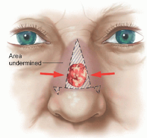 4. Undermine widely by blunt and sharp dissection. At this point, the area beneath the designed flap and the surrounding tissue is undermined by blunt and sharp dissection. Undermining is performed before the flap is incised because it helps to determine the depth to which the incision is carried out. Over the nasal dorsum and sidewalls, undermining and subsequent incision is carried to a submuscular plane, whereas onto the lateral or posterior sidewall and medial cheek, the undermining is carried out to the subcutaneous plane. Difficulties in adequate transposition or reach of the flap are frequently related to inadequate soft tissue undermining and release of fibrous attachments, especially on the side of the pedicle.