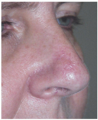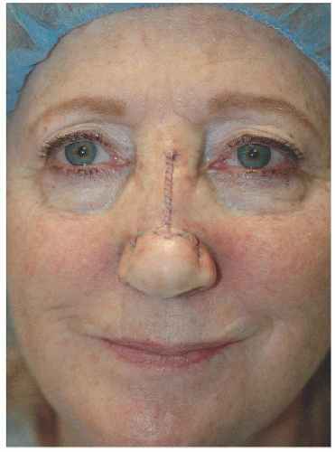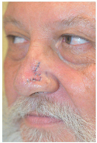 ![]() Figure 5.1D. Final healed result with good color, texture, thickness match, and avoidance of secondary tension vectors on the nasal tip or ala. |
