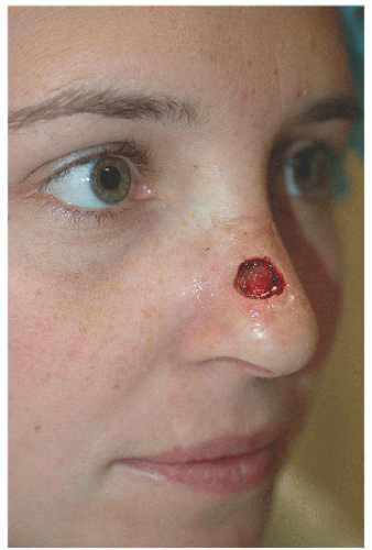 ![]() Figure 5.3A. Surgical defect on the right nasal sidewall adjacent to the cheek and nasomelal fold measures 1.7 × 1.6 cm. |