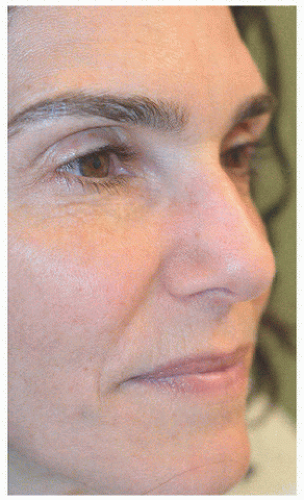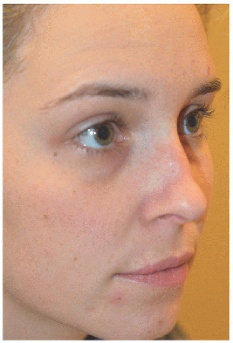The second case illustrates a similar example in a young woman with a 1.5 × 1.3 cm defect on the right nasal dorsum after Mohs micrographic surgery for a basal cell carcinoma (Fig. 5.2F). A bilateral advancement flap was performed, and the healed result demonstrates the appearance 3 months after surgery (Figs. 5.2G and H). In review, a significant amount of tissue can be recruited bilaterally from the nasal sidewalls (carry undermining to the cheek to recruit the greatest loose tissue), and by “sharing” from where tissue is recruited, symmetry of the nose may be better maintained.