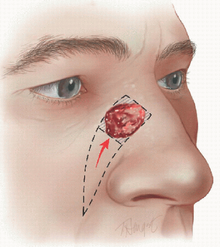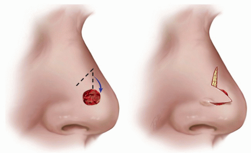 1. Choose between a medial-based and a lateral-based pedicle to the flap. The bilobed transposition flap is most useful for reconstruction of defects on the distal one-third of the nose, primarily the lateral aspect (e.g., nasal ala, alar crease, lateral tip, lateral supratip, and sidewall). For defects on the lateral nasal tip or supratip, a lateral pedicle for the bilobed flap is preferred (Figs. 5.4B and C). For defects on the nasal ala or posterior sidewall, a medial-based pedicle flap works best to keep the flap within one cosmetic subunit, avoid nasal valve dysfunction, and preserve symmetry (see Section 5.9).