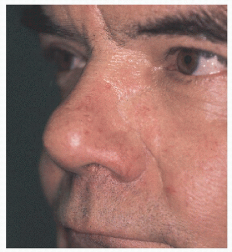 A surgical defect like this one on the nasal sidewall and supratip is well suited for a transposition flap repair such as a bilobed transposition flap (Fig. 5.4A). Rhombic flaps are useful for nasal defects of up to about 1.0 cm in diameter, but the upper limit size may be lesser for defects located within the distal one-third of the nose (e.g., nasal tip and ala). Bilobed transposition flaps are useful for defects of up to about 1.5 cm in diameter in this region. A surgical defect of this size and location repaired by a rhombic flap requires that a larger area be recruited immediately adjacent to the surgical defect. Recruiting a larger share of tissue immediately adjacent to the distal one-third of the nose may cause some depression on the nasal sidewall or nasal asymmetry. A better option may be to use a bilobed transposition flap and “walk” the tissue downward from the more proximal portion of the nose, where there is a greater abundancy of recruitable tissue.