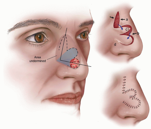 Undermine widely on the nasal sidewall and medial cheek, and incorporate tricone excisions to facilitate advancement of the flaps centrally.