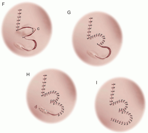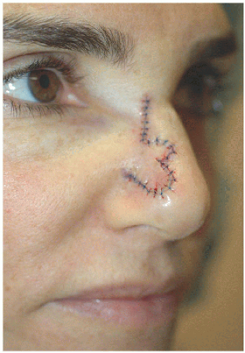 11. Finally, remaining wound edges are approximated and everted with nonabsorbable, simple interrupted or running sutures (Fig. 5.4F “I”). Pressure bandages are applied, and if pressure on the flap causes collapse of the nasal ala or crease, nasal packing is inserted for 24 hours.