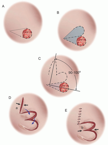 3. Design the two lobes of the flap. The first lobe of the flap (adjacent to the defect) should be the same size as the defect and located at approximately 45 to 50 degrees arc rotation from the tip of the tricone. First described in a scientific lecture by Kunishige and Zitelli as “heart” shaped, this cordiform design illustrates the need for the first lobe to be identical in size to the defect and the angle between the lobes to be approximately 45 degrees (Fig. 5.4E “B”).