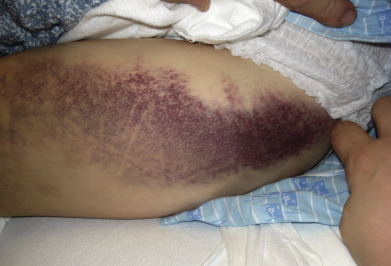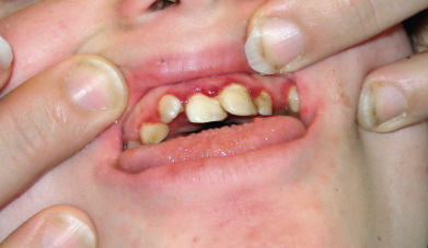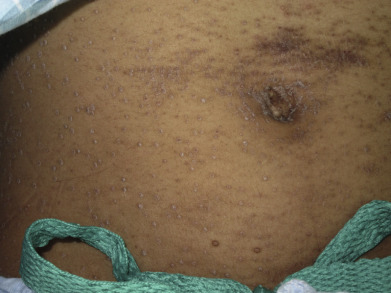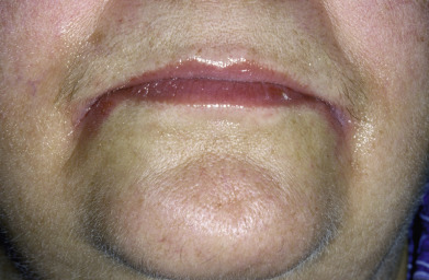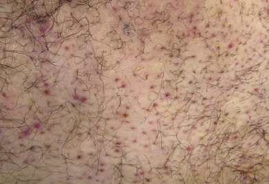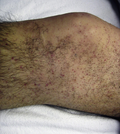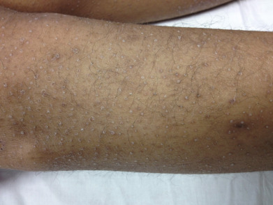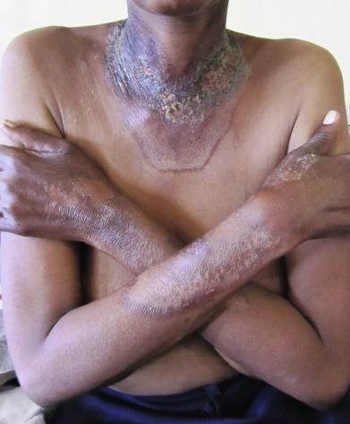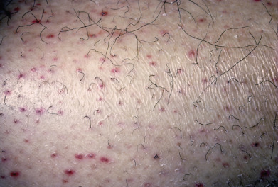 Deficiencies in some essential nutrients cause a particular constellation of mucocutaneous and systemic signs and symptoms worth outlining. These include the bleeding gums, corkscrew hairs, easy bruising. and perifollicular hemorrhages seen in the setting of vitamin C deficiency, or scurvy. In pellagra, or vitamin B 3 (niacin) deficiency, a combination of a photodistributed eruption appearing sunburn-like, scaly, hyperpigmented, or atrophic can be seen along with protracted diarrhea, weakness, dementia, paresthesias, and depression. Kwashiorkor, or protein-energy malnutrition, may present with general lightening of the skin and hair, a scaly eruption with superficial peeling of skin resembling flaking paint, and a dermatitis with cracked skin resembling “crazy pavement” in the setting of a patient with signs of edema and poor growth. These nutritional deficiencies can occur due to general malnutrition where food is scarce, but can also occur in individuals with restricted diets or eating disorders (e.g. anorexia nervosa). Lastly, malabsorption states as found in inflammatory bowel diseases can lead to nutritional deficiencies.