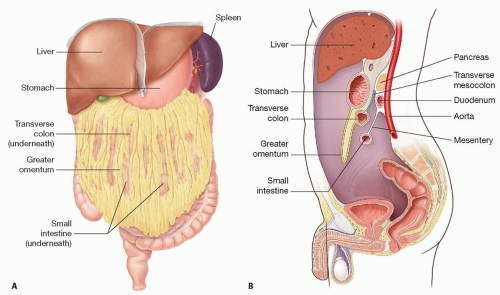 FIG 1 • A,B. The greater omentum extends from the greater curvature of the stomach and drapes over the large and small intestines while folding under itself toward the posterior abdominal wall. The posterior aspect of the reflection apposes the mesentery of the transverse colon.