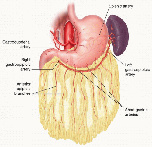 • Along the greater curvature of the stomach, gastric branches arise from both the right and left gastroepiploic arteries onto the anterior gastric wall, and the two vessels communicate in this manner. Multiple branches of these vessels supply the greater omentum (FIG 2).