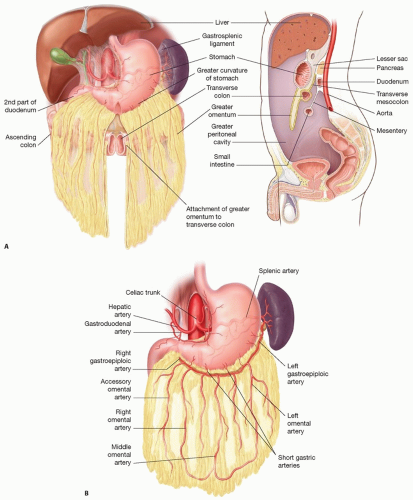 The greater omentum is supplied by the right and left gastroepiploic arteries, which communicate with a rich vascular network within the two layers of the greater omentum along the greater curve of the stomach (FIG 1B).