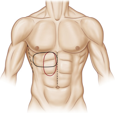 The flap is marked on the skin overlying the perforators of the superior epigastric artery. The flap is marked in the horizontal or vertical direction, with the horizontal design being preferable.