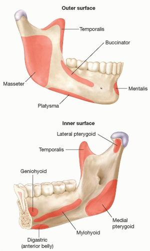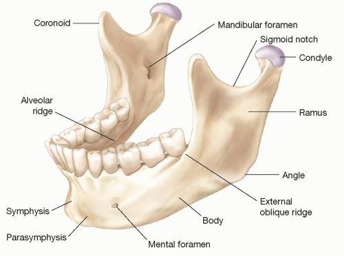 The mandible is divided into paired condyle, coronoid, ramus, angle, body, parasymphysis areas with a single midline symphysis, and tooth-bearing alveolus (FIG 1).