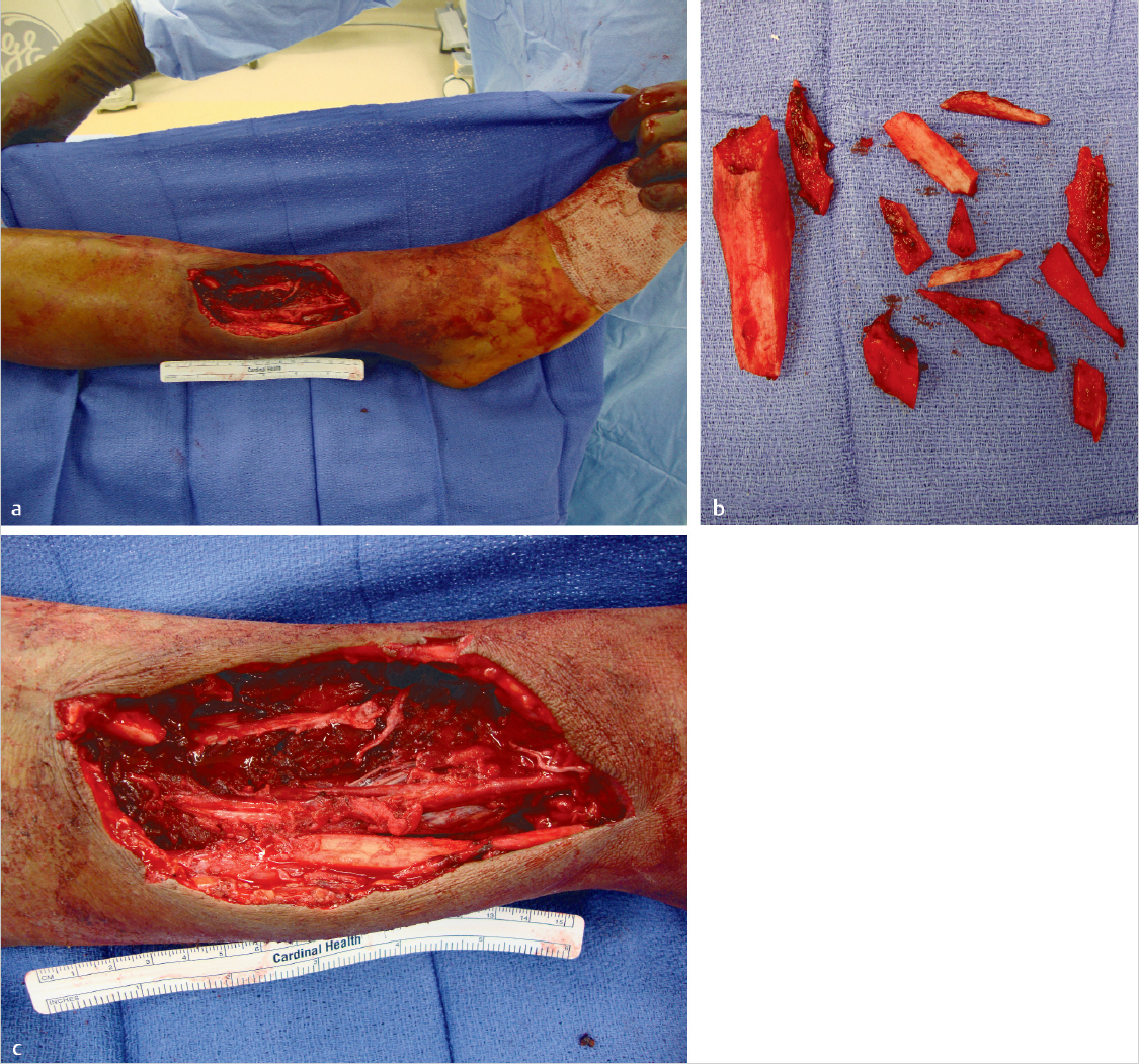 A 35 × 20-cm soft-tissue defect, and a 16-cm tibial bicortical bony defect.