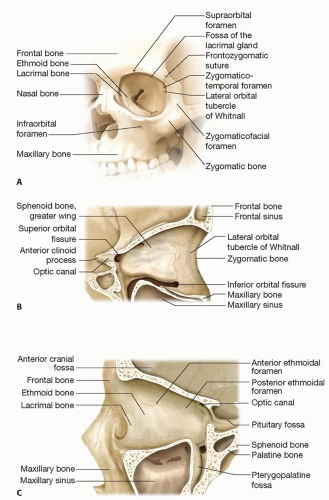 Although the orbit is a pear-shaped cavity with a posteriorly tapering apex to the optic canal, it can be thought of as a box with four walls: medial, lateral, floor, and roof (FIG 1A).