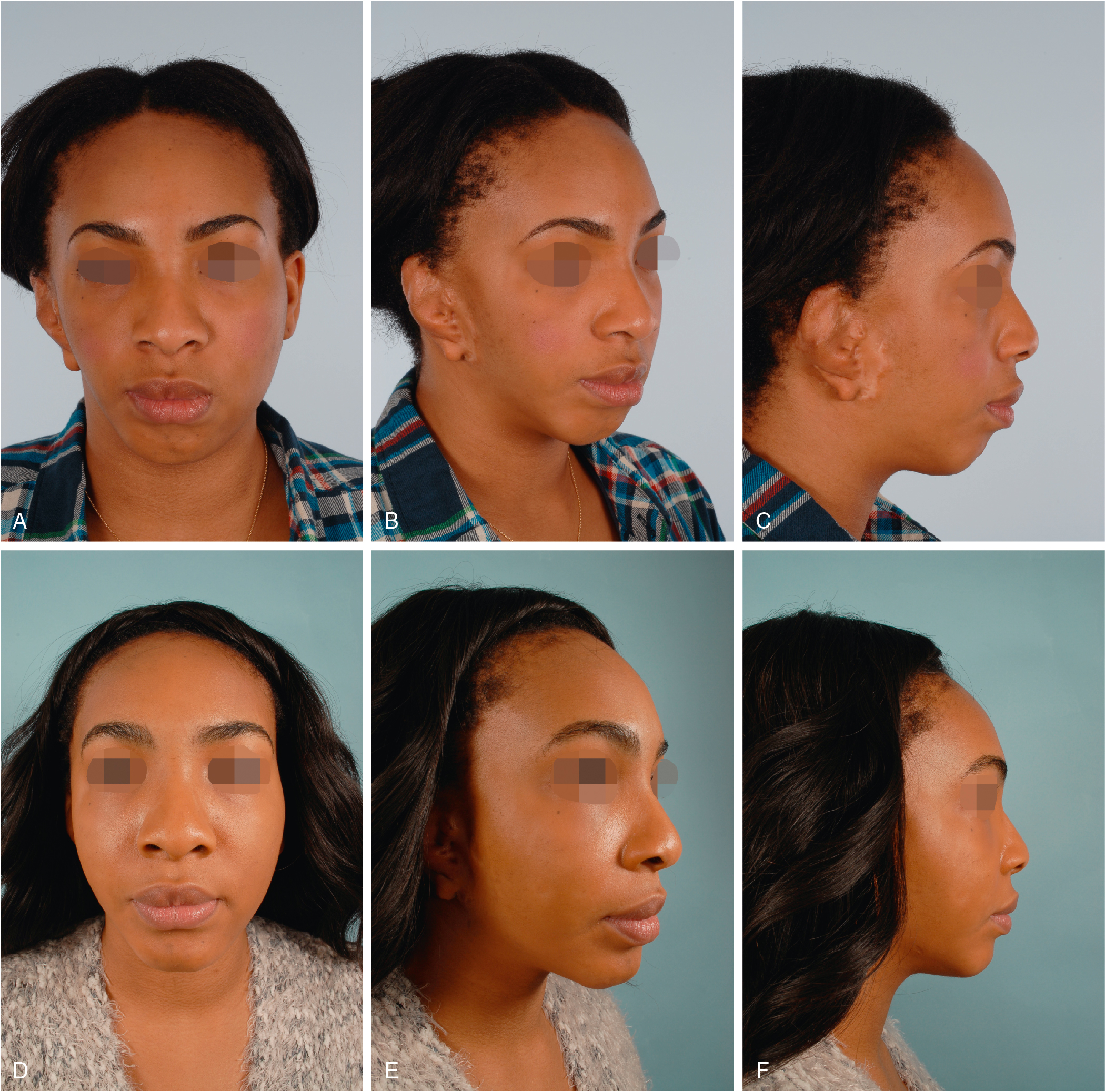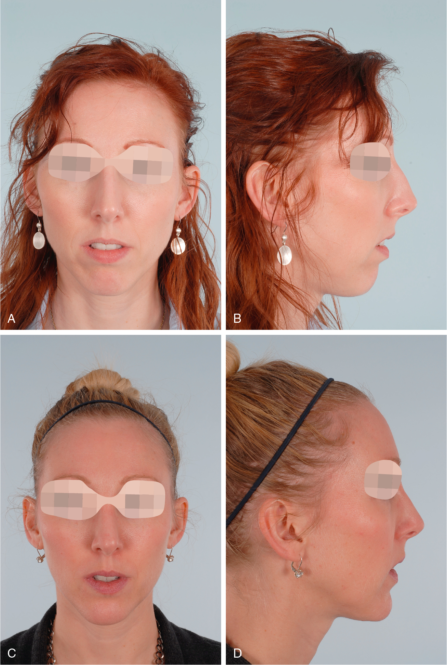 The dentally compensated patients with class II malocclusion represent a large percentage of those who present to the surgeon’s office to reduce their “big” nose and increase their chin projection. The number of patients presenting for chin augmentation and reduction rhinoplasty demonstrates how frequently this situation is encountered. A frequent complaint of the rhinoplasty patient is “my nose is too big.” When nasal analysis is performed relative to the upper face, the nose may be of normal dimension; the perceived appearance is caused by a deficient chin, not a large nose (see Chapter 29 ). Chin augmentation is performed to create the appearance of a normal jaw relationship without the need for jaw surgery; simply advancing the chin may make the “large” nose appear normal. In cases where the patient feels that the nose is too large despite chin advancement, a rhinoplasty is performed in addition to chin advancement (see Fig. 25.1 ).