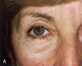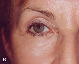 In the past, routine cosmetic blepharoplasties included removal of all the orbital fat pads. The resulting gaunt look has long disappeared from fashion and volume is recognised as an essential part of youthful healthy skin. The author may sculpt fat in the lower lids, for example, but frequently transplants fat into the lacrimal fossae to restore rather than remove volume and minimise the dark circles under the eyes ( Fig. 11.4 A and B).