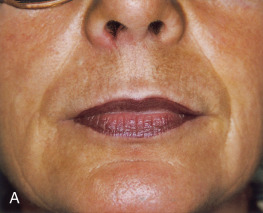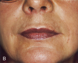 Superficial filling can be very effective ( Fig. 11.7 A and B) and achieved either with Perlane or Restylane. Deep filling may take more than one session ( Fig. 11.8 A and B). Perlane may be placed in the superficial dermis of the nasolabial skin, deep to the epithelium. Deeper placement often fails to ‘lift’ the skin and may be ‘lost’ towards the sinuses. Warn the patient that this layer will become slightly compressed by facial movements and recommend a top-up over the same layer after 6 weeks. This compensates for the compression of the initial layer and achieves a long-lasting effect.