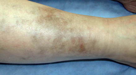 Up to one-third of patients who receive antimalarials for over 4 months will develop a blue–gray to black hyperpigmentation on their shins ( Fig. 130.2 ), face, palate and/or nail beds ( Table 130.5 ). The discoloration fades after cessation of therapy, but may take months to years to resolve completely. Reversible bleaching of the hair roots (achromotrichia) occurs in up to 10% of patients, presumably due to interference with melanosomal function. Another 10–20% may develop an exanthem, ranging from urticaria to lichenoid reactions to exfoliative erythroderma. Of interest, morbilliform and urticarial exanthems have been observed with greater frequency in individuals with dermatomyositis as compared to those with LE.
