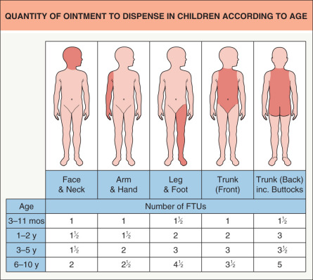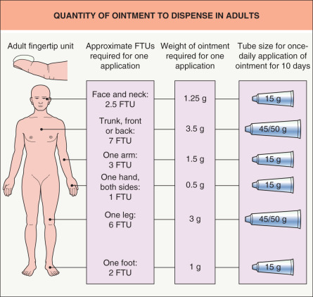 A practical guide to quantifying the amount of ointment necessary to treat different areas of the body is the “fingertip unit” (FTU), which represents the amount of ointment dispensed from a 5 mm-diameter nozzle that extends from the distal crease to the tip of the index finger in an adult . One FTU is equal to ~0.5 g, and the quantities required to treat various areas of the body in adults and children are presented in Figs 129.1 and 129.2 . The appropriate amount to treat the entire body of an adult man is ~20 g, therefore requiring ~250 g per week if applied twice daily. Because ~0.5 FTU (0.25 g) can treat an area equivalent to one side of an extended (“flat”) hand, estimating the number of “flat hand areas” of affected skin assists in determining the amount of medication needed. For example, four “flat hand areas” would require 1 g per application and ~15 g per week if applied twice daily.