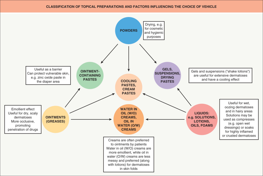 A classification of topical formulations and clinical guidelines for vehicle selection are presented in Fig. 129.3 . A discussion of how vehicles affect drug delivery is found in Chapter 124 .