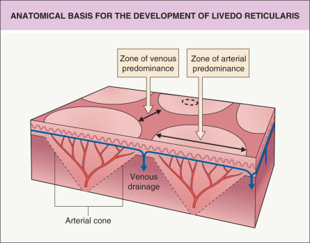LR results from alterations in blood flow through the cutaneous microvasculature system ( Fig. 106.1 ). The latter consists of arterioles that are oriented perpendicularly to the skin surface. The vessels then divide into capillary beds that in turn drain into a subpapillary plexus. It has been proposed that this arrangement of vessels gives rise to a series of 1–3 cm cones with the ascending arteriole at the apex of each cone. At the edge of the cone, the venous plexus is more prominent and the arterial bed is diminished. Any process that either reduces blood flow to and through the skin or reduces drainage of blood out of the skin will result in the accumulation of deoxygenated blood in the venous plexus, leading to the clinical appearance of LR .
