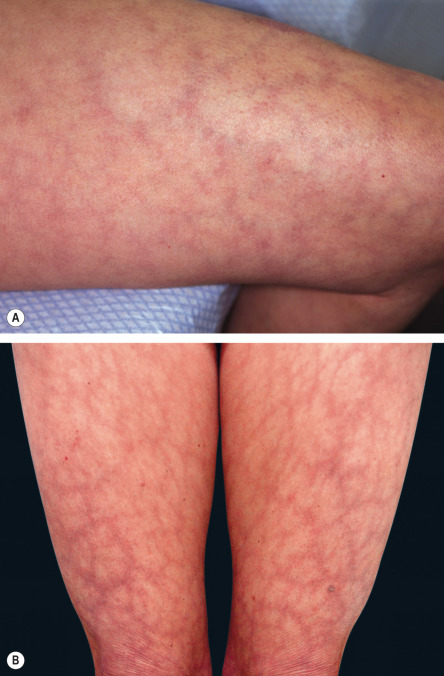 A An even, net-like pattern is seen on the thigh in physiologic livedo reticularis. B Livedo reticularis in a patient with systemic lupus erythematosus.