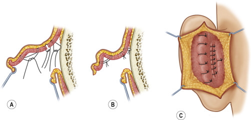 The defect in the concha is closed primarily using numerous 4–0 nylon sutures.