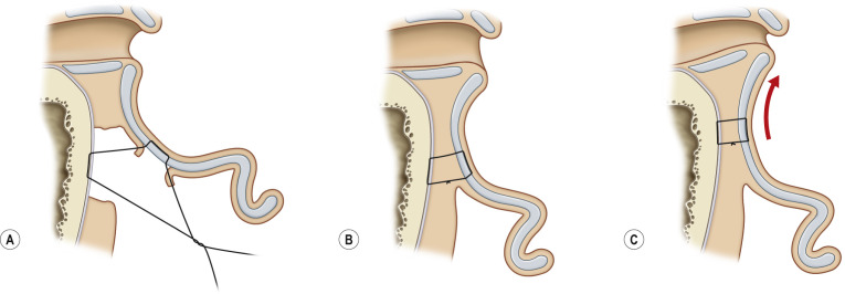 Technique for the standard otoplasty. The combination of Mustarde sutures, conchal resection/closure, and concha–mastoid sutures is shown. (A) Suture placement. (B) Suture tightened and ties appropriately. (C) Position of sutures as shown from the surgeon’s vantage point.