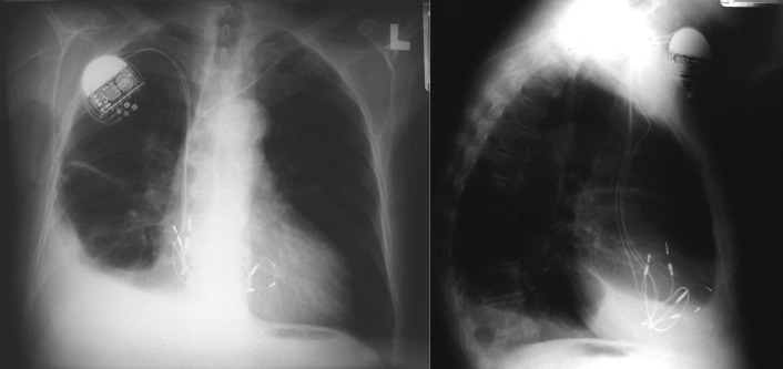 Pacemaker leads are apparent, and ICDs are more obvious because of their larger coils. Coronary sinus leads for cardiac resynchronization therapy are finer leads.