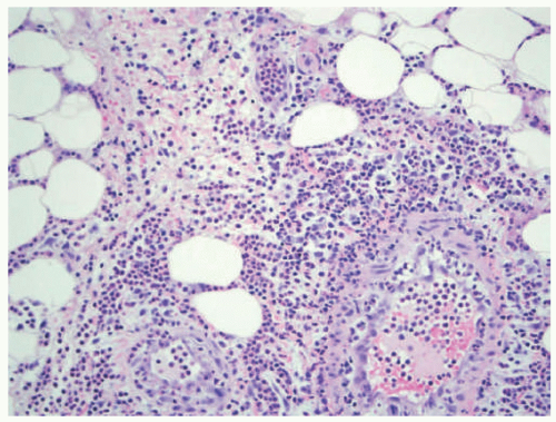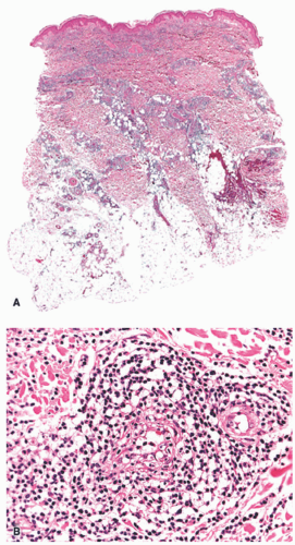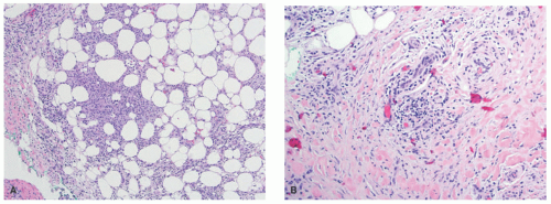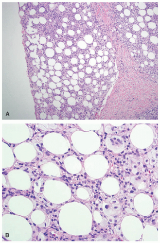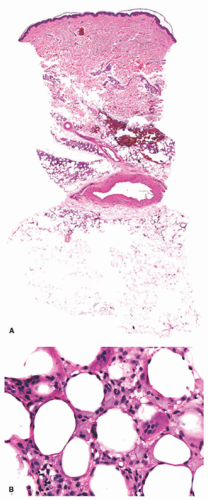In early lesions, this disorder presents with lipophagic panniculitis, characterized by a dense mixed inflammatory infiltrate centered on the subcutaneous fat lobules, with numerous foamy lipophages (Figure 5-7A and B).22 Neutrophils are often present in early disease, with histiocytes predominating in later lesions. There is no vasculitis. In very established lesions where clinical atrophy is longstanding, the infiltrate may be sparse, with notable atrophy and fibrosis of the fat lobules.20