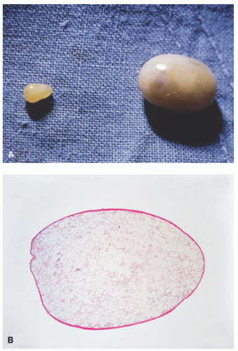 Acute or chronic trauma of the fat presents histologically as a lobular panniculitis, with chronic mixed inflammation and foci of fat necrosis and lipomembranous change. Low-power examination often reveals cystic spaces in the fat lobules. Hemorrhage and hemosiderosis are common, and fibrosis is usually present in chronic lesions. Clinical hypertrichosis has been reported overlying plaques of traumatic panniculitis, but is not associated with histologic changes of the hair follicles.42 A “mobile encapsulated lipoma” is a discrete focus of traumatized and necrotic fat that has been isolated in the skin (Figure 5-13A). It is often surprisingly mobile beneath the skin surface. It demonstrates identical histologic features, but in a small, encapsulated deep dermal nodule (Figure 5-13B).43