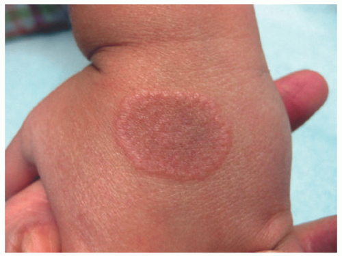 The lesions of GA are comprised of small skin colored to pink/violaceous individual papules coalescing to form an annular or circinate plaque without scale (Figure 5-14). The four most common clinical variants are localized, generalized, subcutaneous, and perforating GA. Localized GA typically involves the extremities, specifically the wrists, ankles, and the dorsal surface of the hands and feet. By definition, generalized GA must involve the trunk and at least one set of extremities and may follow a more protracted course than other variants.45 The perforating morphology may present as grouped papules with central umbilication, crusting, and scaling. Subcutaneous GA presents with subcutaneous nodules on the feet, anterior tibial surface, fingers, hands, or scalp. This variant can appear clinically similar to rheumatoid or pseudorheumatoid nodules, but both of these diagnoses are much less common in children than in adults.46