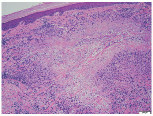 Classic GA is characterized histologically by necrobiotic granulomas in the superficial and mid dermis. These demonstrate altered, eosinophilic, and thickened collagen at the center, with lymphocytes and histiocytes surrounding in a palisaded manner (Figure 5-15). Eosinophils may be present, and scattered multinucleate histiocytes are frequent. Mucin deposition is present in the necrobiotic foci, a feature that helps distinguish GA from other granulomatous infiltrates. The mucin can be demonstrated with the use of Alcian blue or colloidal iron stains. A perivascular lymphocytic infiltrate is usually noted in the surrounding dermis. In the interstitial form of GA, histiocytes intercalate between dermal collagen bundles, giving a “busy” appearance to the dermis at low-power examination, without distinct necrobiotic foci. Interstitial mucin is present.