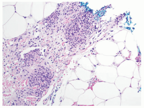 infiltrate of the fat lobules with a relative sparing of the septi (Figure 5-12). Leukocytoclasis can be very prominent in the absence of frank vasculitis.
