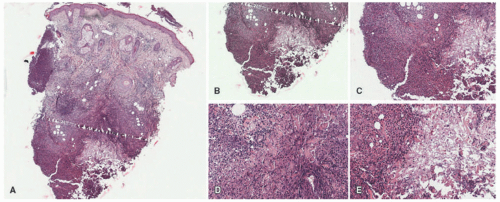 EI is histologically identical to nodular vasculitis. Because mycobacteria is not consistently identified in cases of EI, and because numerous inflammatory and other triggers are known to result in the clinical and histologic features of nodular vasculitis, this distinction in nomenclature between the two entities has fallen out of favor within dermatopathology as well, with many authors preferring a unified description.10 EI-nodular vasculitis is characterized histologically by a primarily lobular panniculitis, with lymphohistiocytic granuloma formation and variable necrosis (Figure 5-3A). Vasculitis is the most reliable finding and may present as a necrotizing form in early lesions (Figure 5-3B).11 Careful search for mycobacterial organisms should be done, using special stains (AFB [acid-fast bacilli], FITE) or immunohistochemistry for tuberculosis.