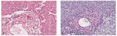 Alpha-1 antitrypsin deficiency presents as a lobular panniculitis, classically neutrophil-predominant in early lesions, and demonstrating lymphocytes and histiocytes in more long-standing nodules. Liquefactive necrosis of dermal collagen and lipocytes is characteristic, and correlates clinically with oily drainage from ulcerated plaques (Figure 5-4).15 Collagenolysis of fat septae is also common. In the liver, cirrhosis is typical, with the presence of globular inclusions in the periportal areas (Figure 5-5).