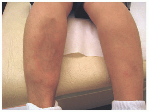 Similar to adults, EN within children classically presents as pretibial red, tender nodules measuring 1 to 5 cm in diameter (Figure 5-1). Nodules evolve to adopt a reddish-brown or ecchymotic appearance and may persist for 4 to 8 weeks.1 Less common locations include the thighs, arms, trunk, and face. EN should not suppurate or ulcerate and such findings should prompt an evaluation for an alternative diagnosis. Fever, malaise, and arthralgias may precede the development of EN and accompanying lower extremity edema and pain can lead to difficulty with ambulation. Most cases can be managed with supportive care, including bedrest, leg elevation, and nonsteroidal anti-inflammatory drugs. In cases complicated by severe pain, treatment with potassium iodide or colchicine can hasten resolution. Although recurrent cases of pediatric EN have been documented, recrudescence is uncommon.2