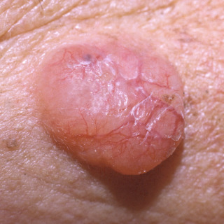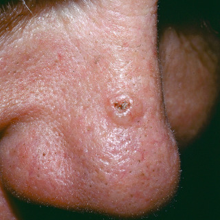 • Nodular ( Fig. 30.1 ): BCC presenting as a translucent (pearly) papule or nodule, often with central ulceration ( Fig. 30.2 ), variable telangiectasias, and possible pigmentation (particularly in persons with darker skin and eyes). Pigmented BCC may be difficult to differentiate from melanoma ( Fig. 30.3 ). This is the most common BCC subtype in the head and neck area.