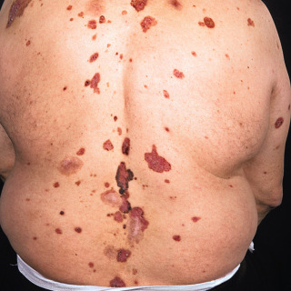 Patient with basal cell nevus syndrome with nodular and superficial basal cell carcinomas, including some that are focally pigmented.