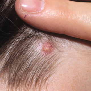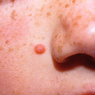 Patient with Spitz nevus presenting as a red papule with focal telangiectasia.