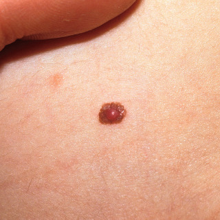 • Spitz nevi may arise on normal skin or in other lesions, including junctional nevi, compound nevi ( Fig. 30.7 ), intradermal nevi, and nevus spilus ( Fig. 30.8 ).