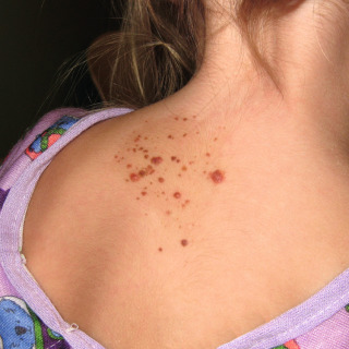 Patient with multiple red Spitz nevi occurring within a nevus spilus. The smaller brown lesions are compound and junctional nevi.