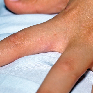 Hand of a patient with scabies. There are small erythematous papules of the intertriginous space, a characteristic location.