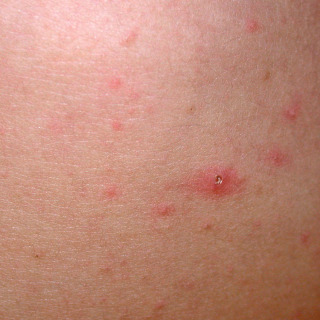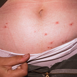 Patient with scabies. There are small erythematous papules of the trunk, with one lesion demonstrating an excoriation.