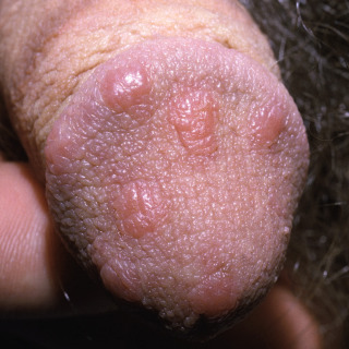 Patient with so-called nodular scabies. The name is somewhat of a misnomer because most lesions are large papules. These diagnostic lesions are almost exclusively seen on the head of the penis.