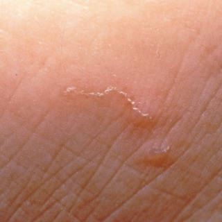 Scabies burrows. There is a small, new linear burrow on the bottom and an older burrow on the top.